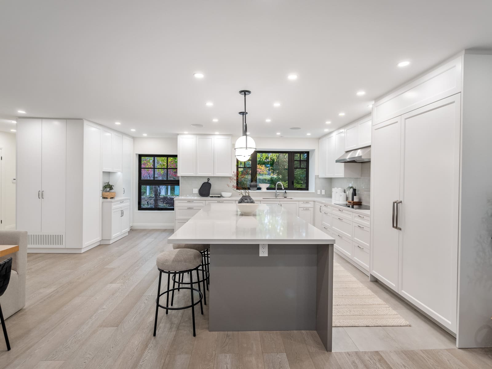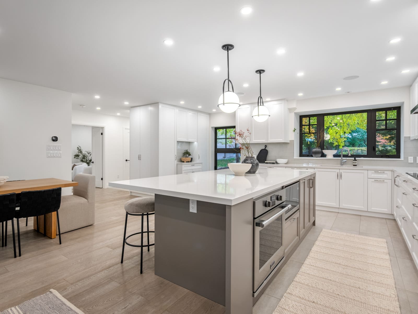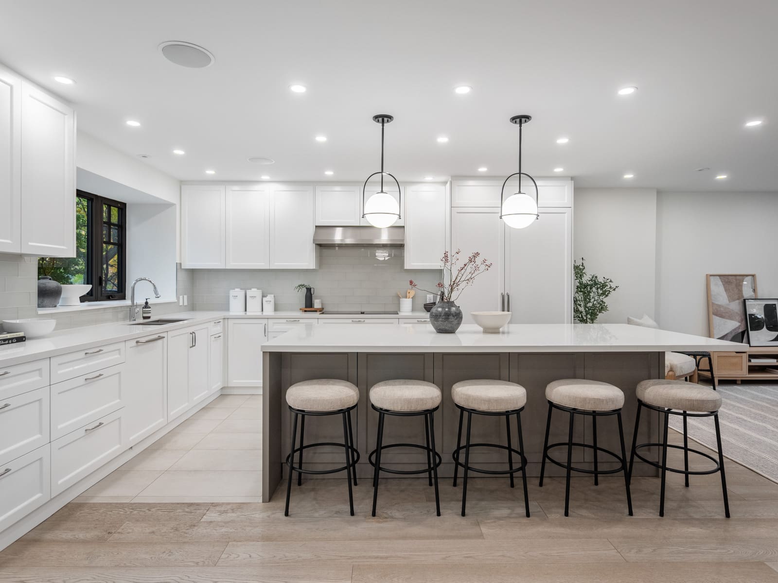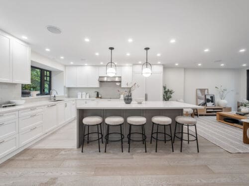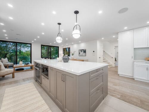 Inside, the main floor reinterprets a classic centre-hall layout for modern living. The formal living room offers an elegant space for conversation and quiet gatherings, while the opposite wing opens into a bright, connected kitchen, dining, and family area designed for effortless entertaining. Expansive windows along the rear of the home flood these spaces with natural light, creating a seamless connection to the outdoors. The chef’s kitchen anchors the layout with an oversized island, bespoke cabinetry, and premium appliances — the perfect blend of function and sophistication. A main-floor powder room completes this thoughtfully designed level.