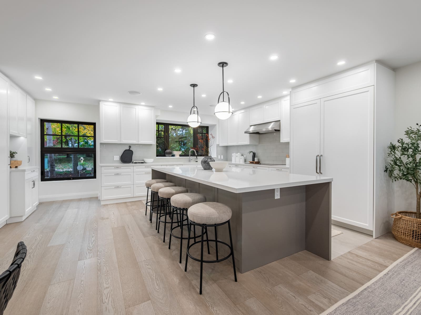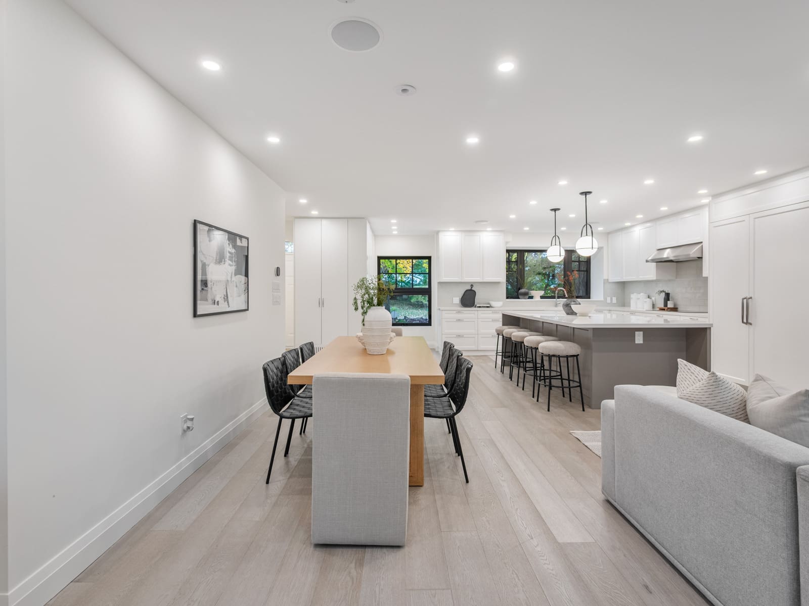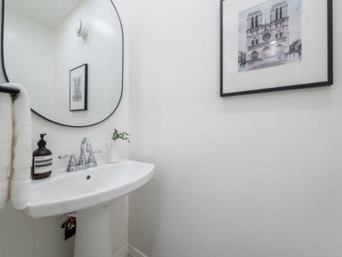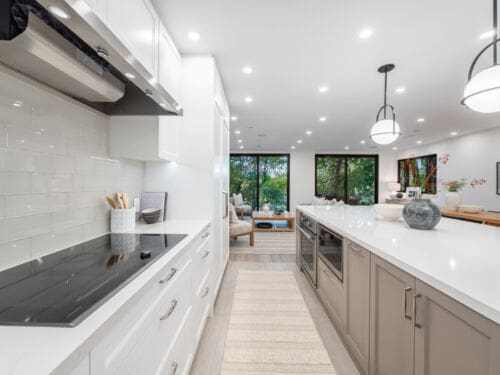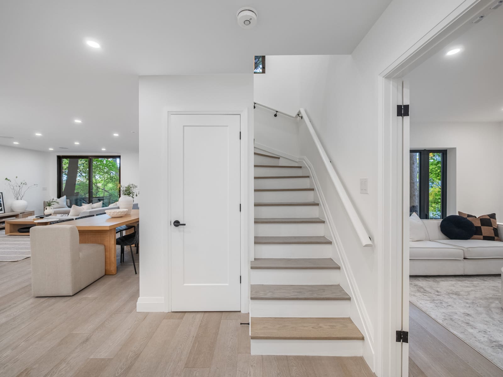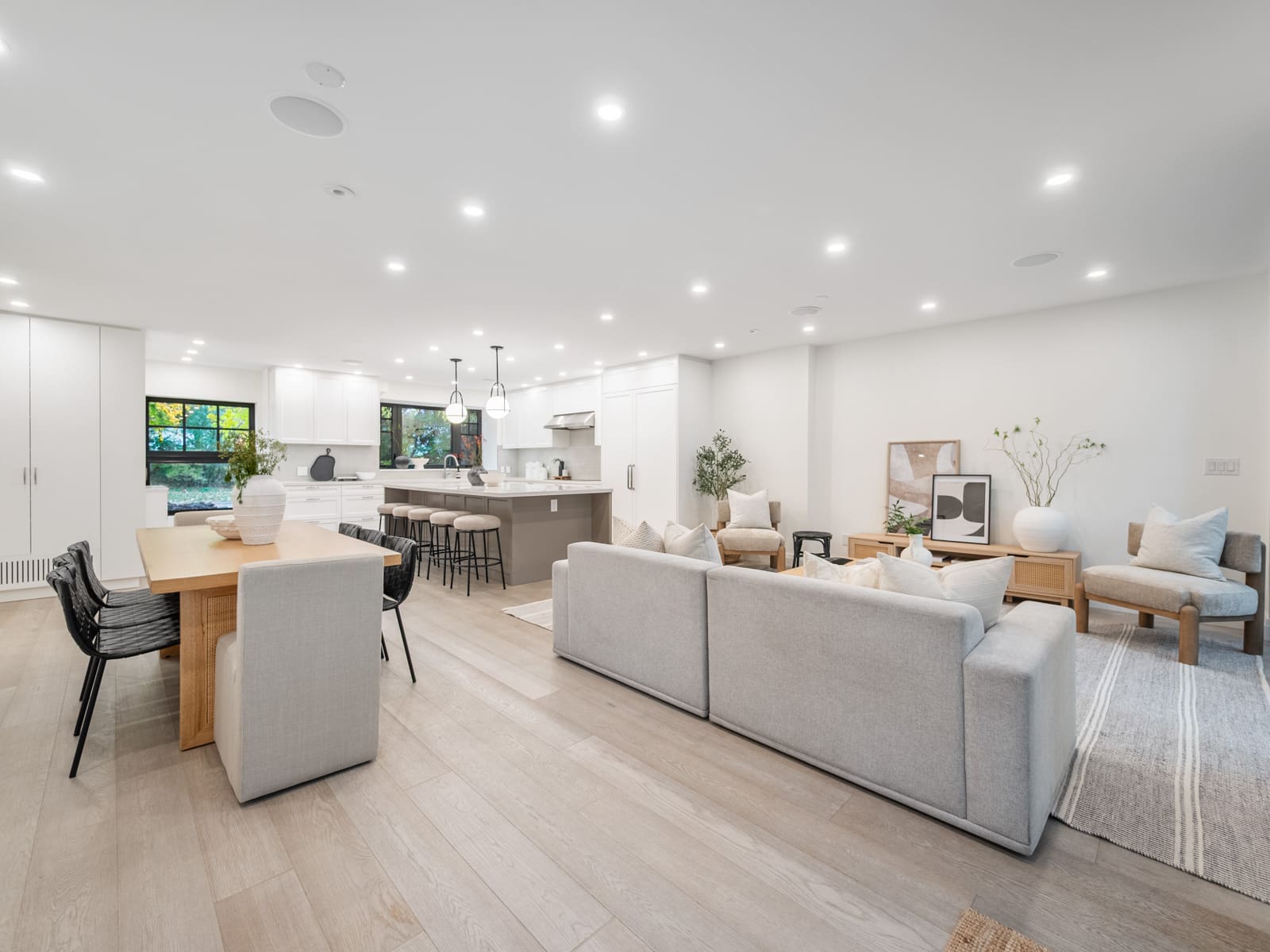 Inside, the main floor reinterprets a classic centre-hall layout for modern living. The formal living room offers an elegant space for conversation and quiet gatherings, while the opposite wing opens into a bright, connected kitchen, dining, and family area designed for effortless entertaining. Expansive windows along the rear of the home flood these spaces with natural light, creating a seamless connection to the outdoors. The chef’s kitchen anchors the layout with an oversized island, bespoke cabinetry, and premium appliances — the perfect blend of function and sophistication. A main-floor powder room completes this thoughtfully designed level.