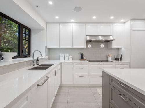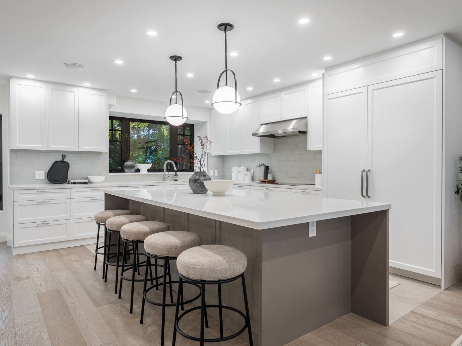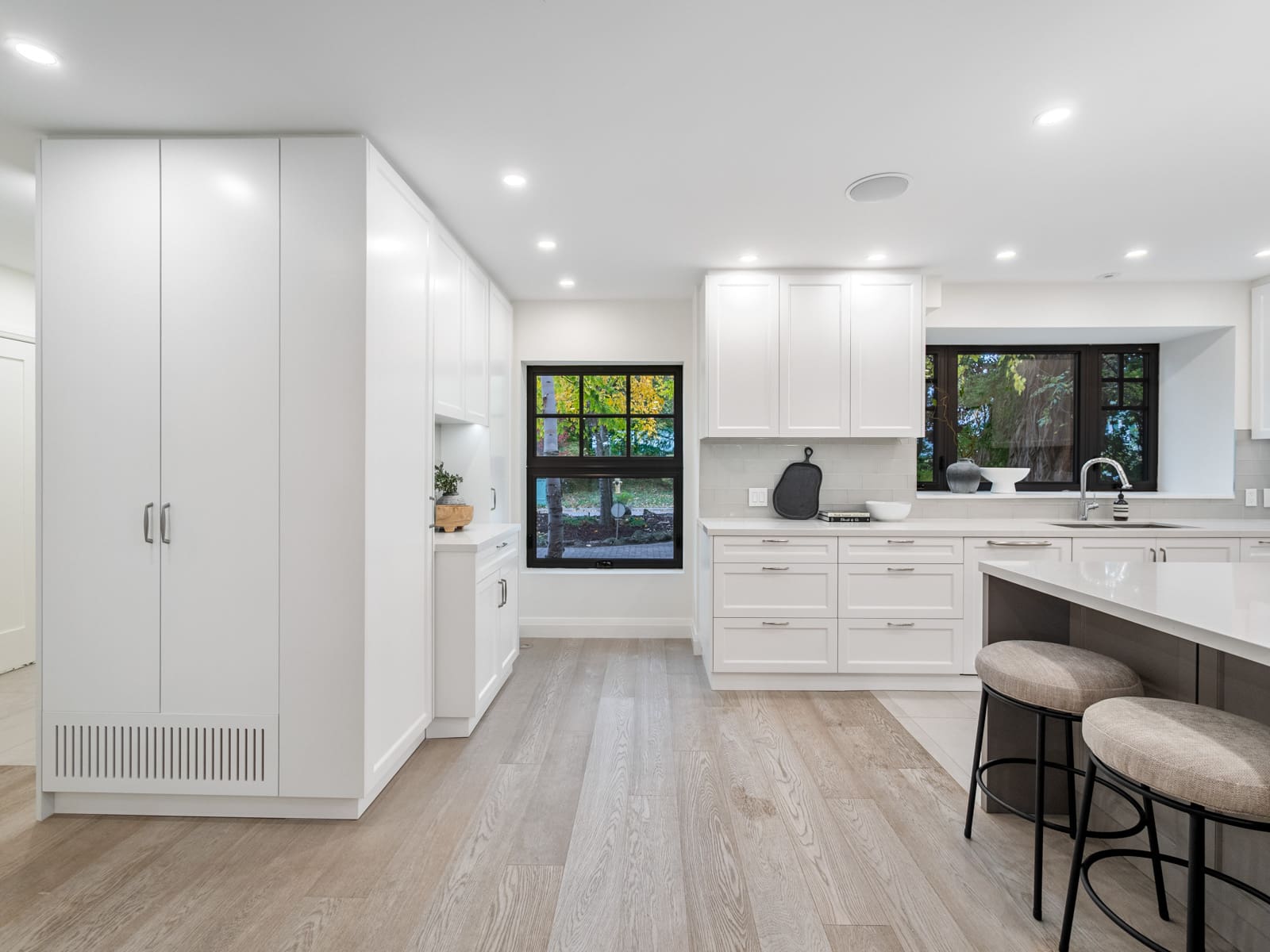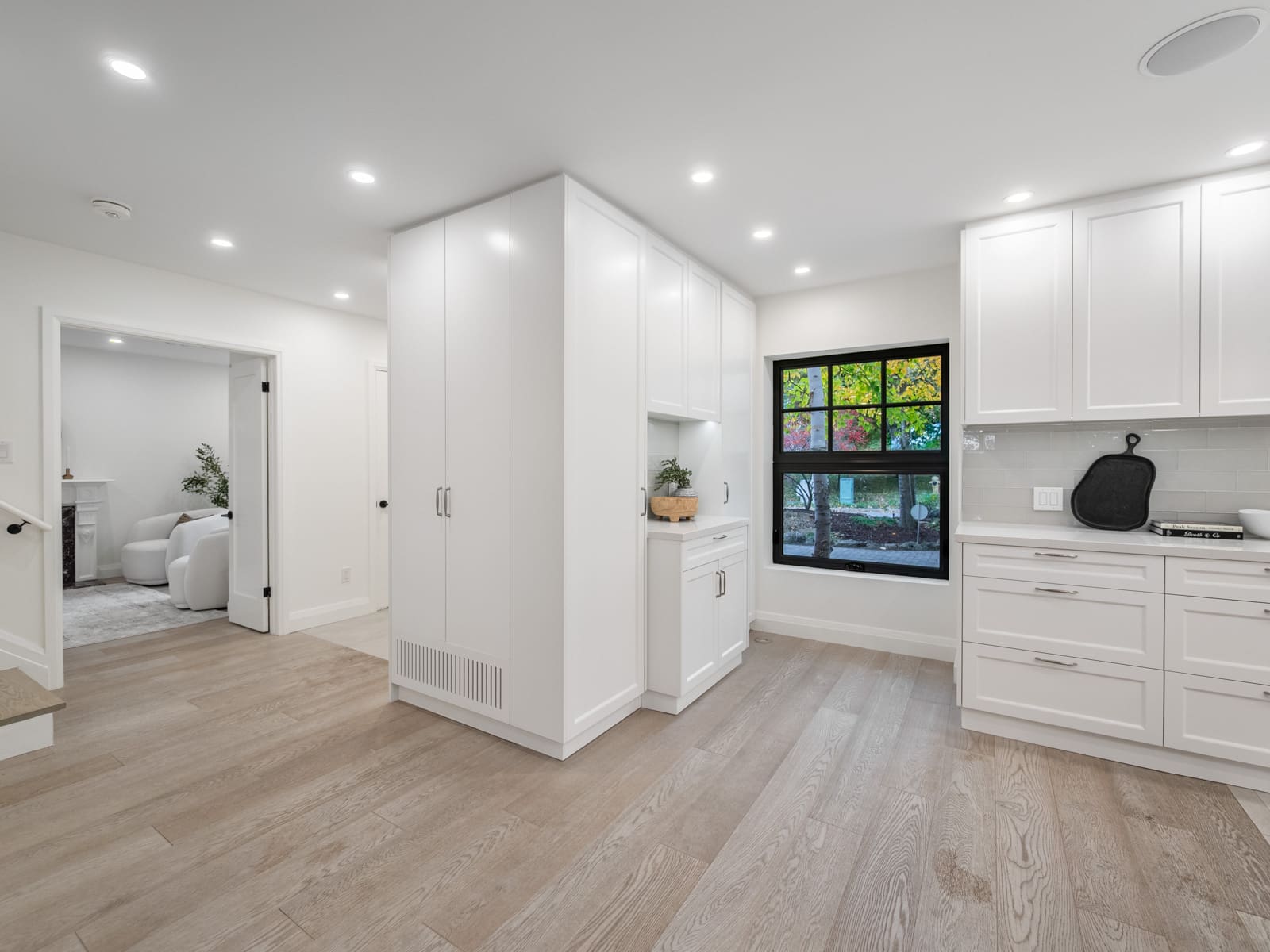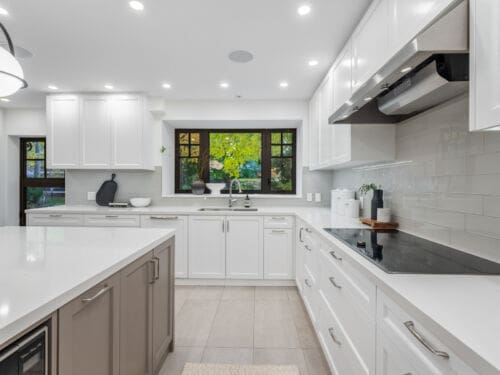 Inside, the main floor reinterprets a classic centre-hall layout for modern living. The formal living room offers an elegant space for conversation and quiet gatherings, while the opposite wing opens into a bright, connected kitchen, dining, and family area designed for effortless entertaining. Expansive windows along the rear of the home flood these spaces with natural light, creating a seamless connection to the outdoors. The chef’s kitchen anchors the layout with an oversized island, bespoke cabinetry, and premium appliances — the perfect blend of function and sophistication. A main-floor powder room completes this thoughtfully designed level.