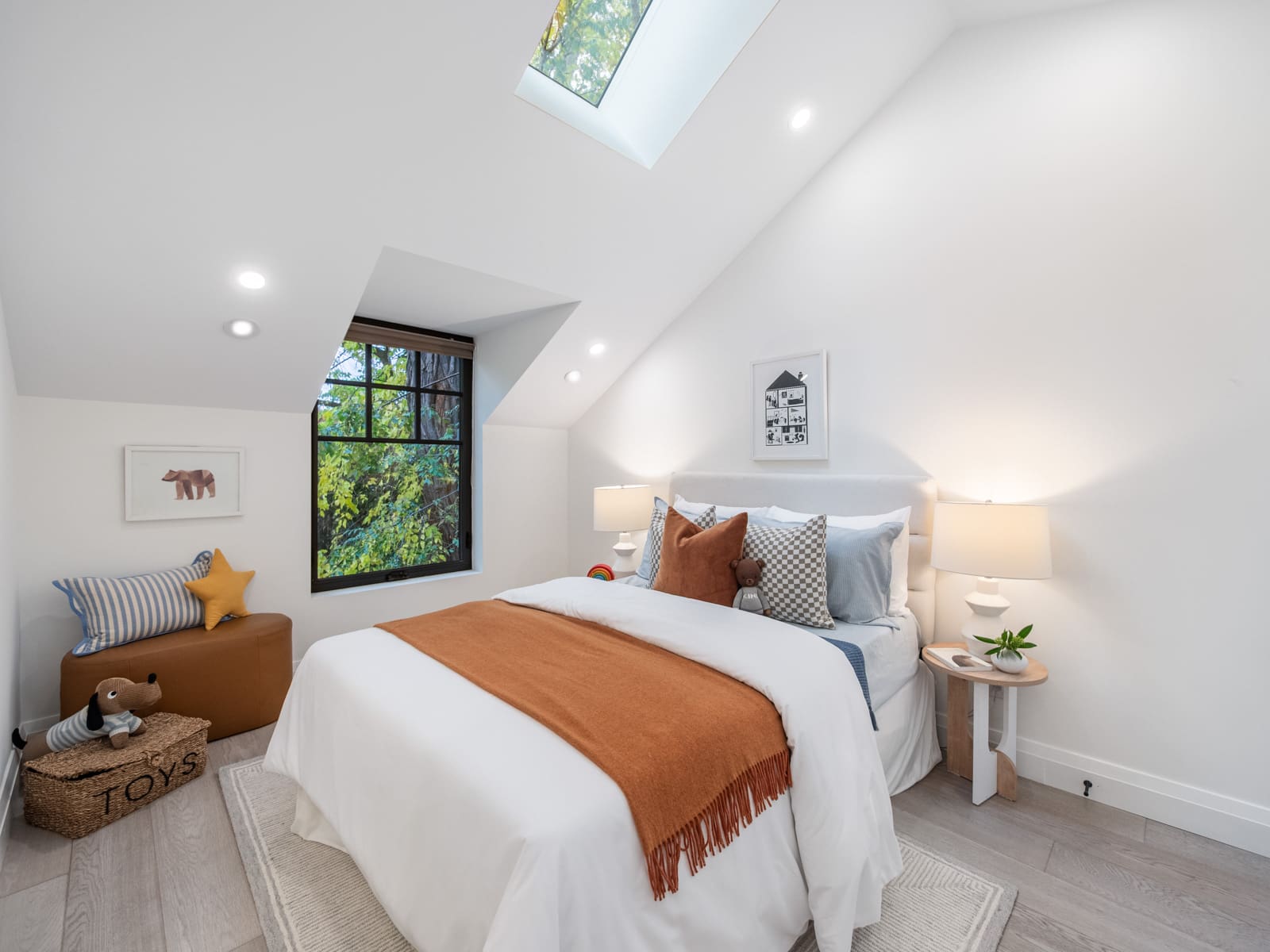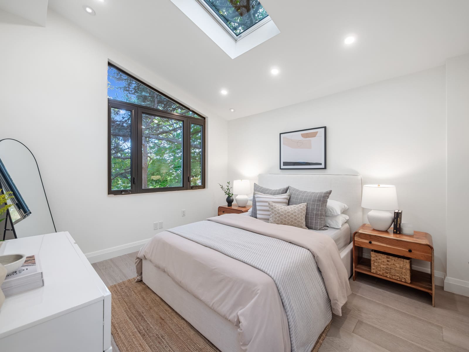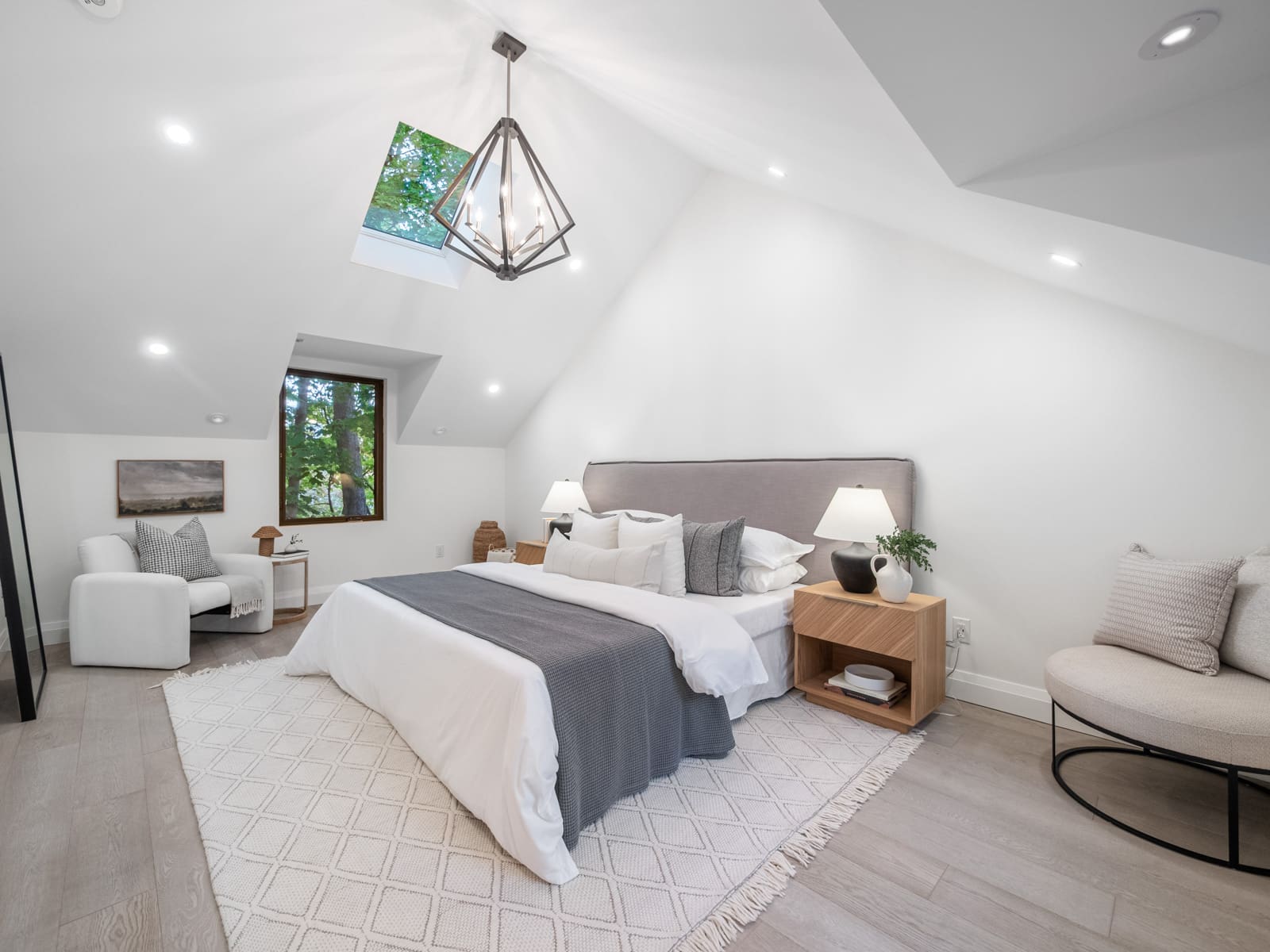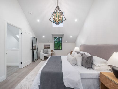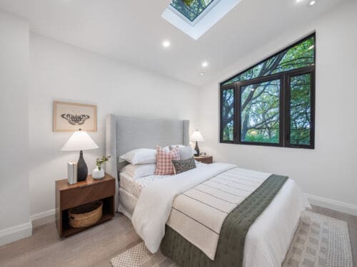 Upstairs, you’ll find four generous bedrooms and three beautifully appointed washrooms, including a primary suite with vaulted ceilings, a spa-inspired ensuite, and a walk-in closet. The second floor is brightened by six skylights, filling the space with natural light and warmth. Each additional bedroom offers exceptional light and comfort — one with its own ensuite. There is also a convenient laundry room, adding everyday practicality to the thoughtful design.