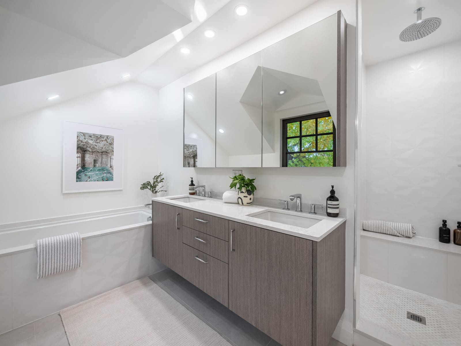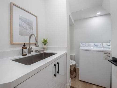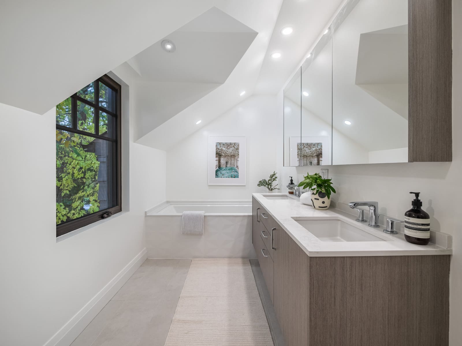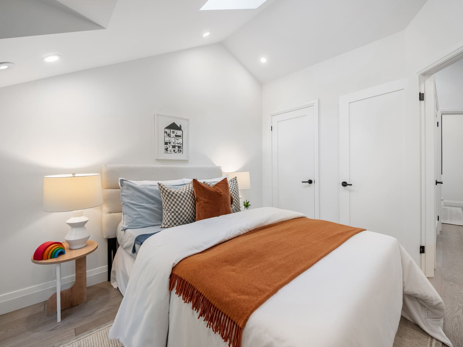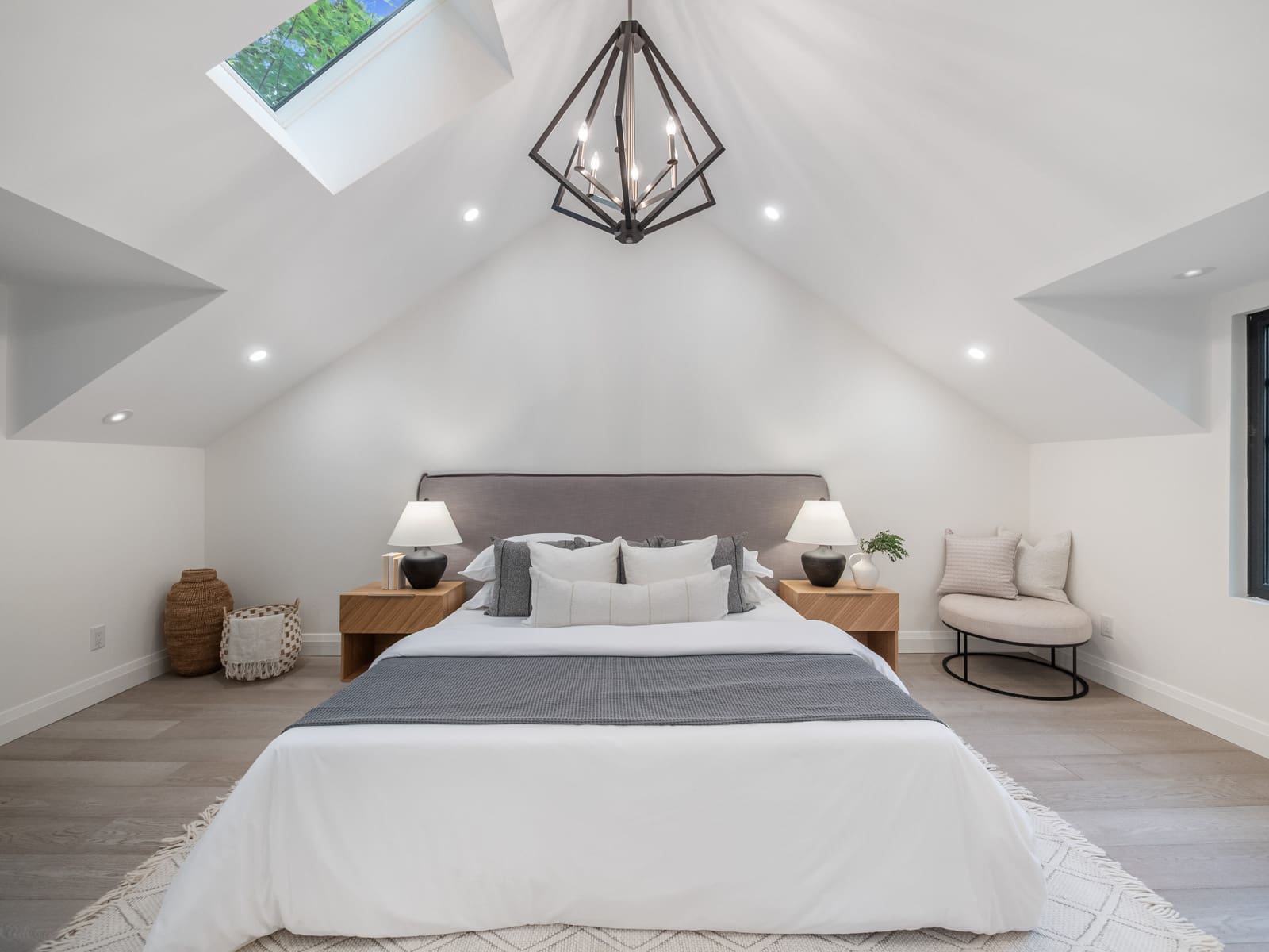 Upstairs, you’ll find four generous bedrooms and three beautifully appointed washrooms, including a primary suite with vaulted ceilings, a spa-inspired ensuite, and a walk-in closet. The second floor is brightened by six skylights, filling the space with natural light and warmth. Each additional bedroom offers exceptional light and comfort — one with its own ensuite. There is also a convenient laundry room, adding everyday practicality to the thoughtful design.