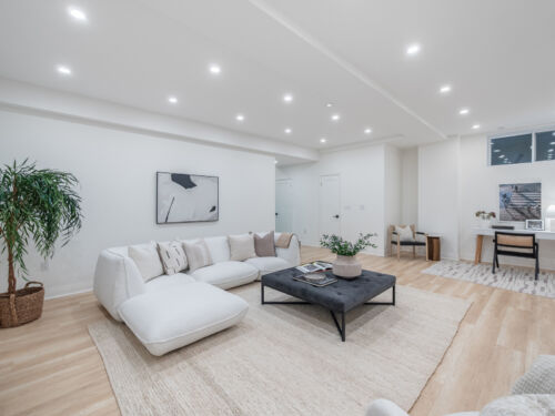 The finished lower level impresses with 9-foot ceilings, a second laundry room, and two full washrooms, including a guest bedroom with a private ensuite. A spacious recreation area offers endless flexibility for a gym, playroom, or media lounge.