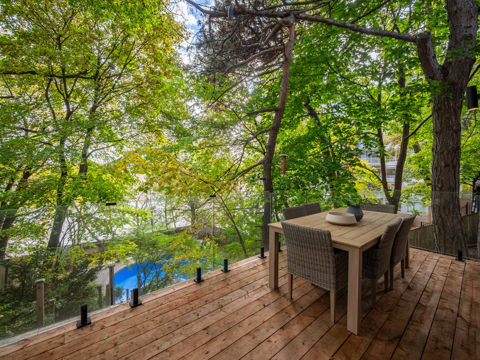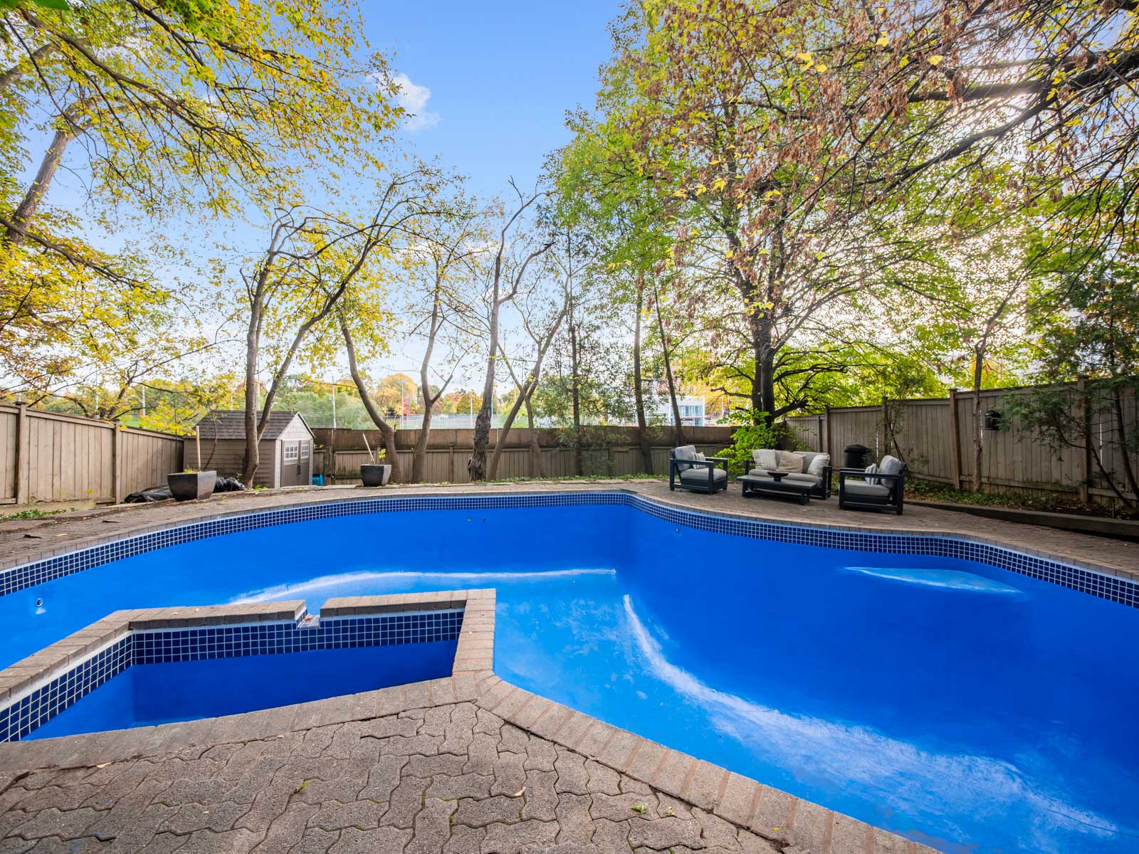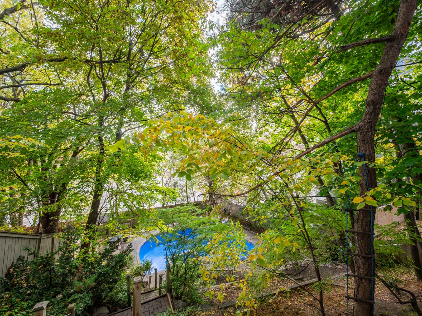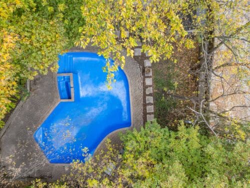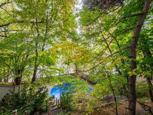 The professionally landscaped backyard, with its pool, patio, and mature trees, evokes a cottage-like serenity — an ideal setting for summer entertaining or quiet relaxation.