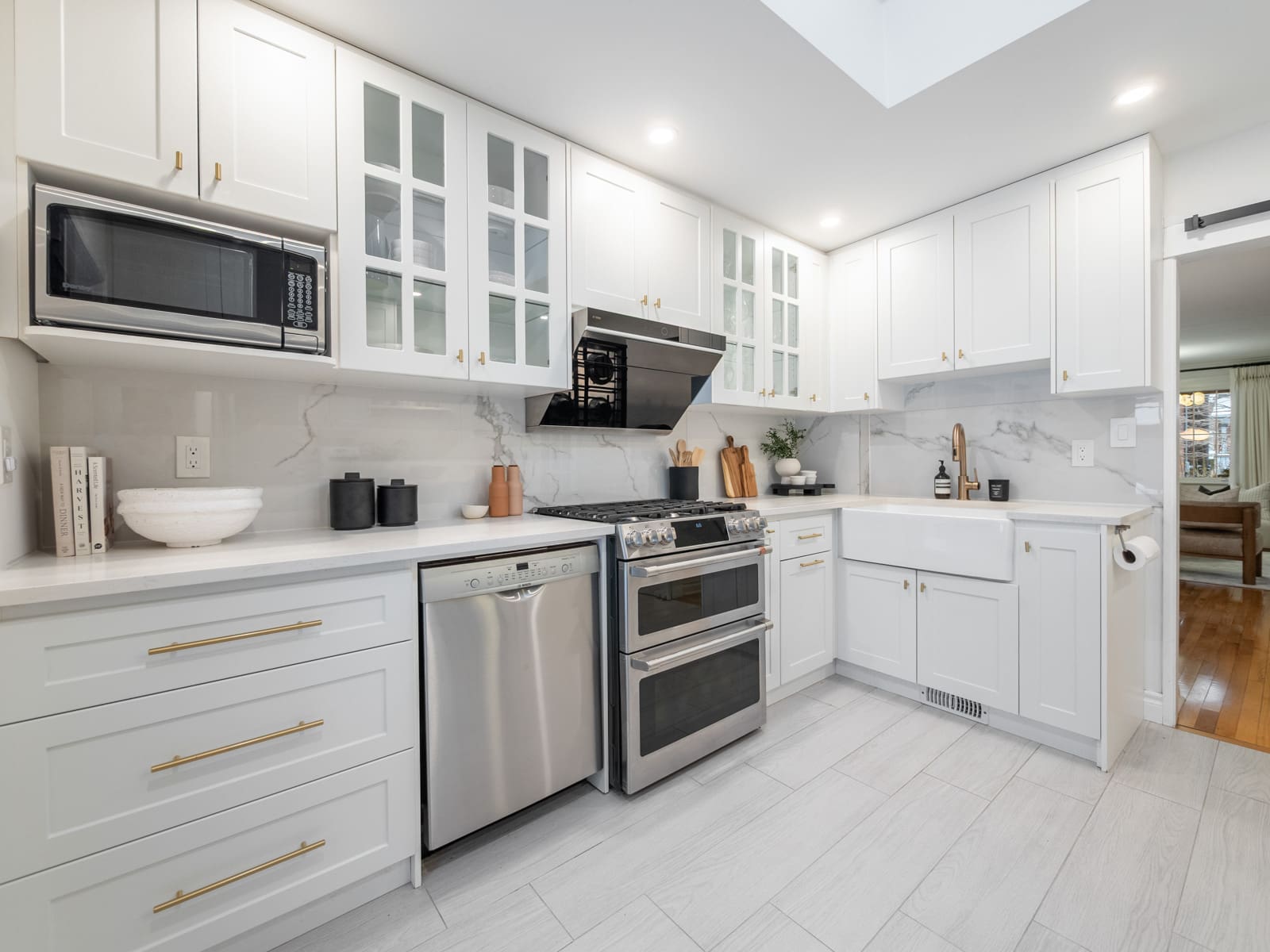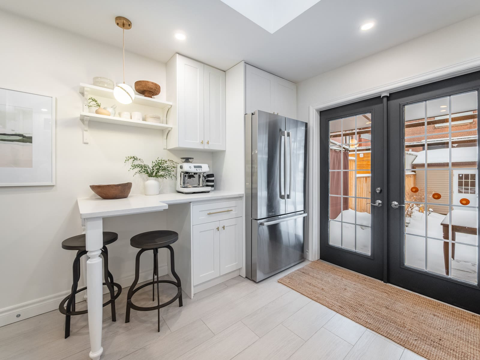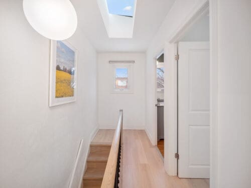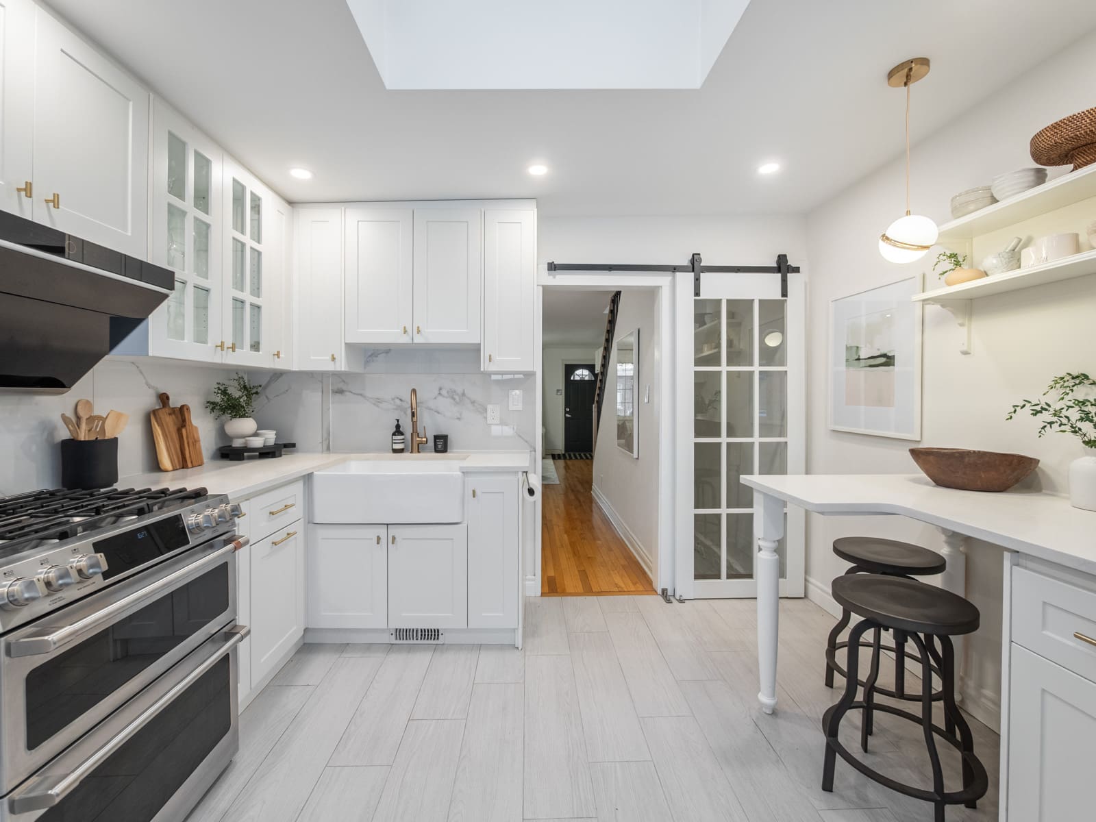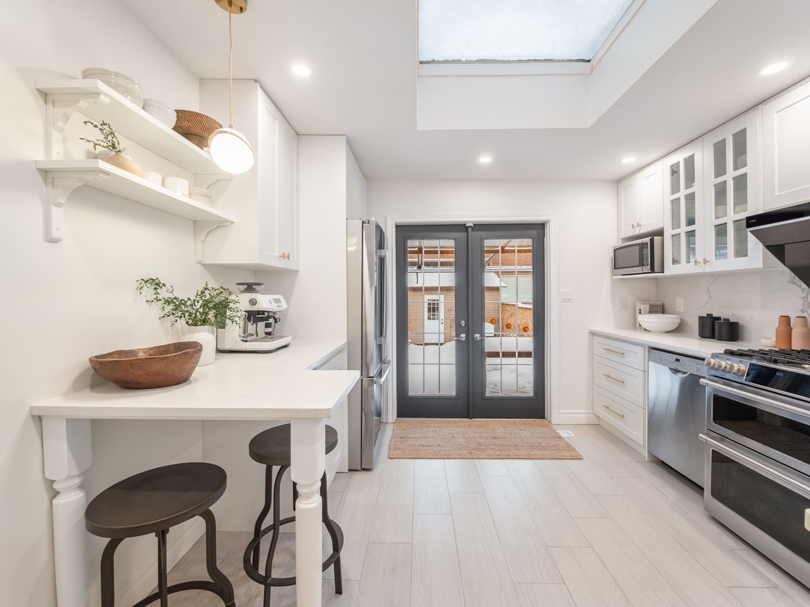 The renovated kitchen is a true standout, complete with custom cabinetry, stainless steel appliances, quartz countertops, skylights, and a walk-out to the private garden — perfect for summer evenings and relaxed weekends at home.