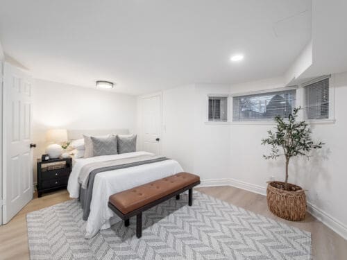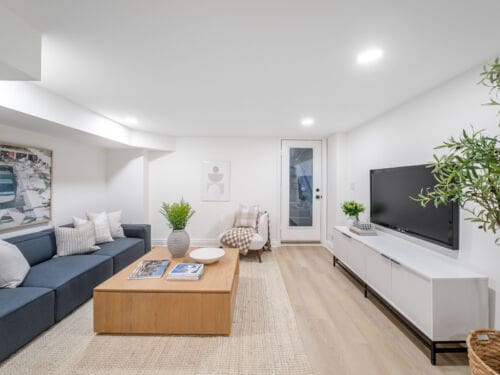 The fully renovated lower level offers excellent ceiling height and a walk-out to the garden, creating a bright and versatile space with an additional living area and guest bedroom, ideal for visitors, a home office, or extended family living.