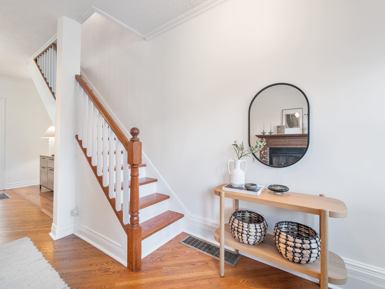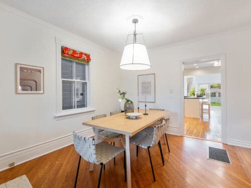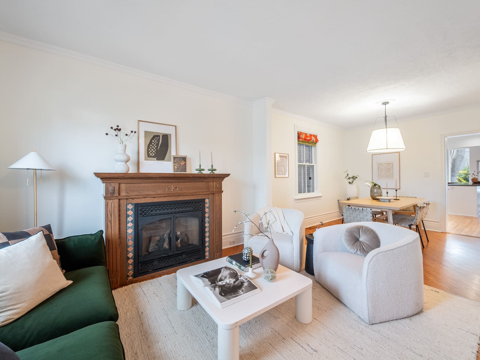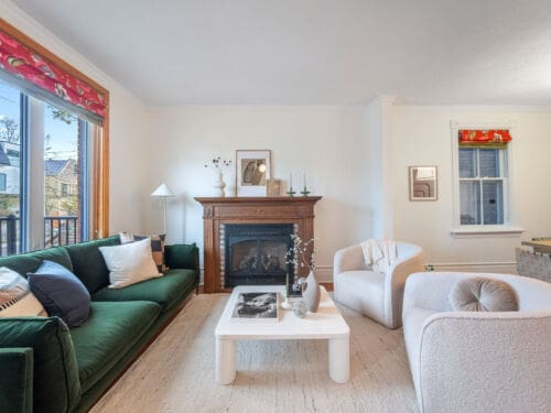 Drenched in natural light, the home features spacious principal rooms adorned with beautiful original wood trim and large windows throughout. The inviting living room offers a cozy electric fireplace, creating a warm and welcoming space to gather.