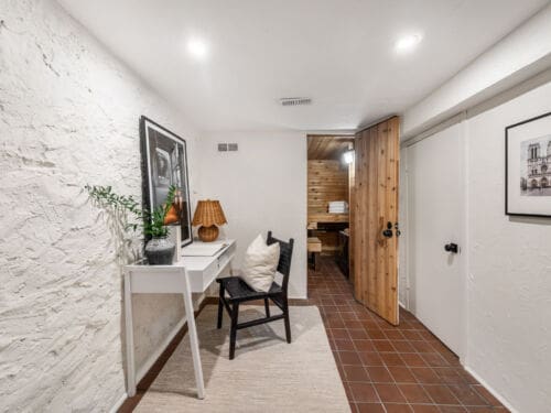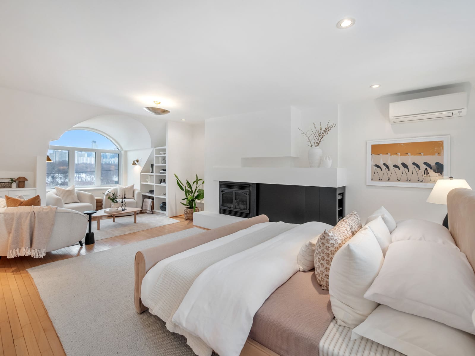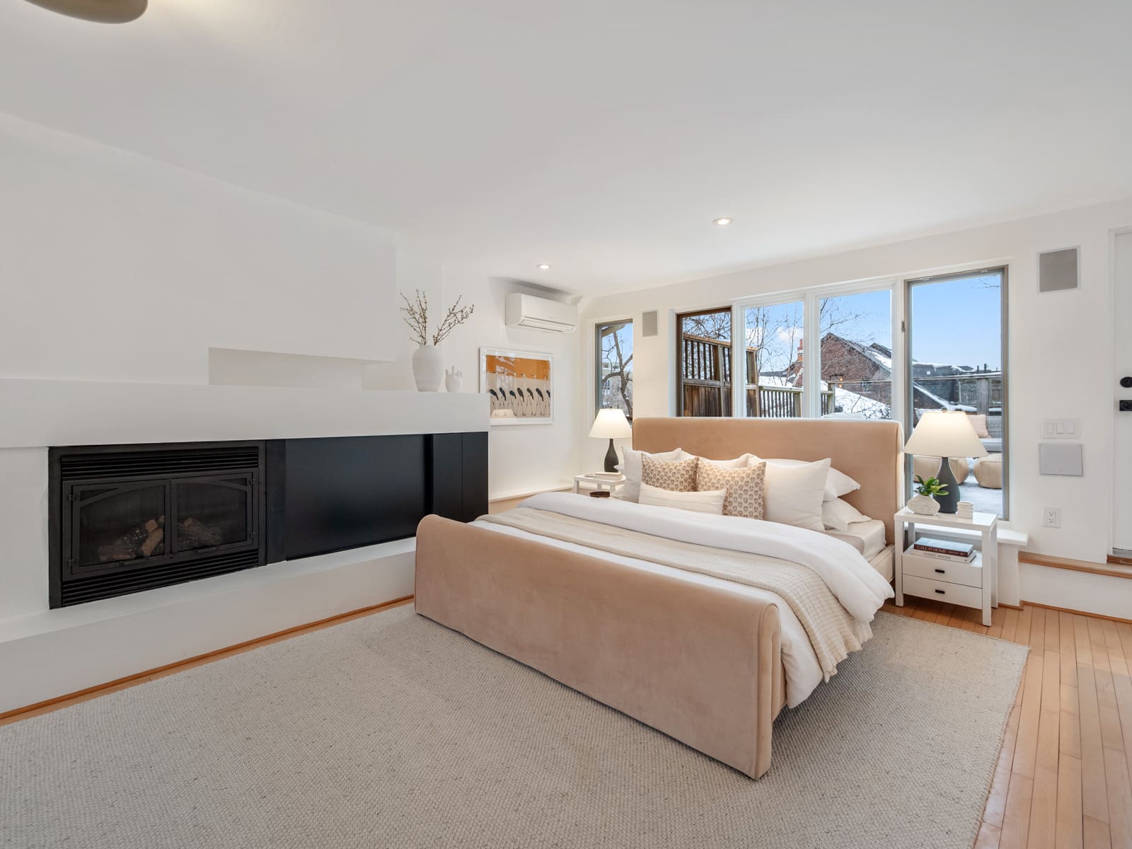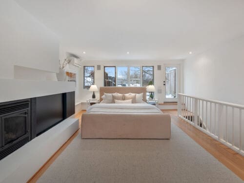 The third-floor primary suite is truly special: a grand, airy retreat with sweeping city views, a gas fireplace, and a walk-out to a large private deck — an ideal spot to unwind and enjoy the peaceful treetop surroundings.