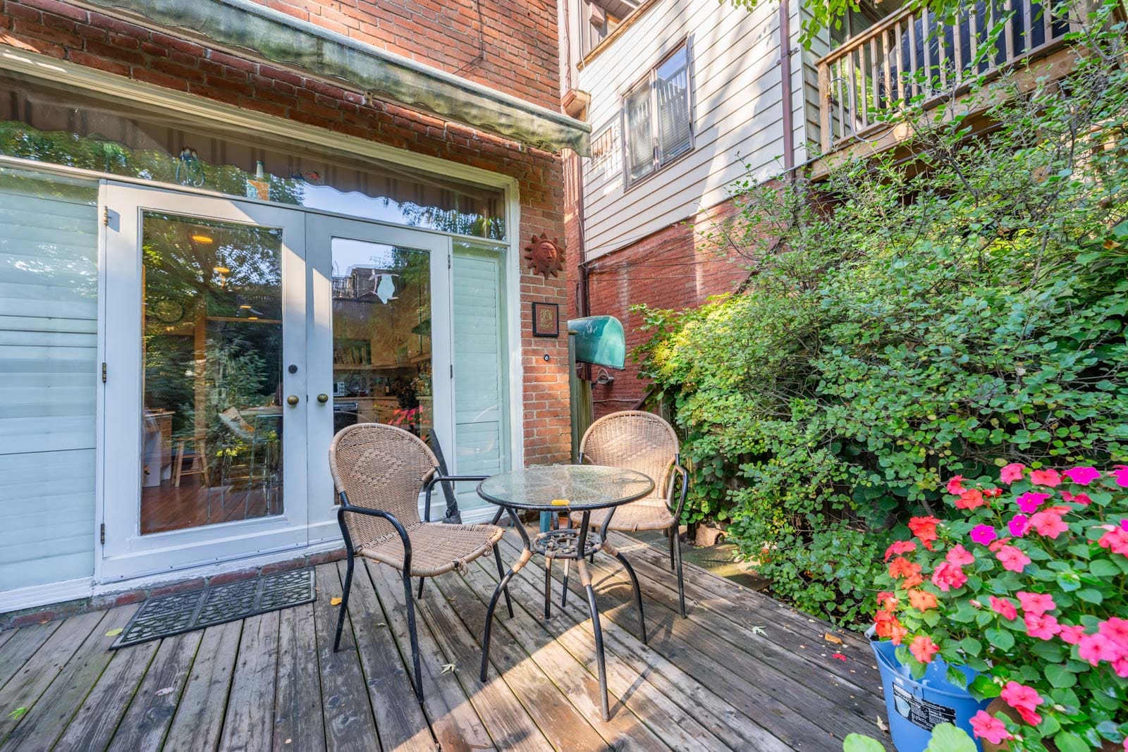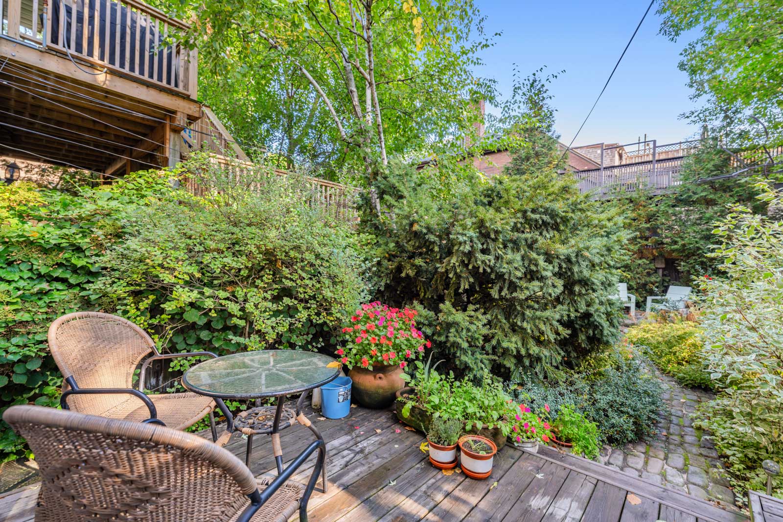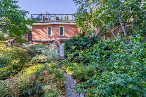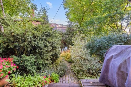 The main floor is exceptionally spacious, featuring rich hardwood floors and large picture windows that draw in abundant natural light and showcase stunning sunsets over Riverdale Park. A cozy wood-burning fireplace anchors the space, and the functional layout flows seamlessly into an updated, generously sized family kitchen with ample storage and a walk-out to a private garden — perfect for summer dining and quiet mornings alike.