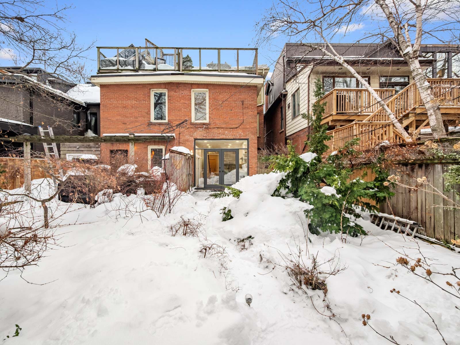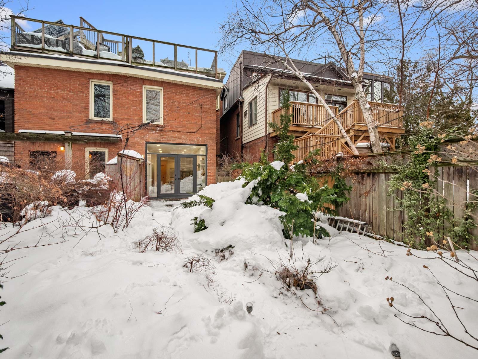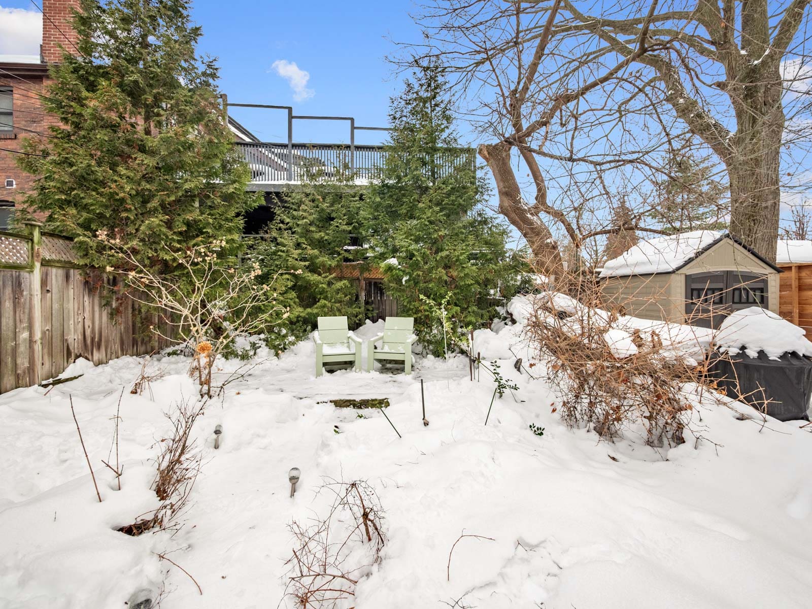 The main floor is exceptionally spacious, featuring rich hardwood floors and large picture windows that draw in abundant natural light and showcase stunning sunsets over Riverdale Park. A cozy wood-burning fireplace anchors the space, and the functional layout flows seamlessly into an updated, generously sized family kitchen with ample storage and a walk-out to a private garden — perfect for summer dining and quiet mornings alike.