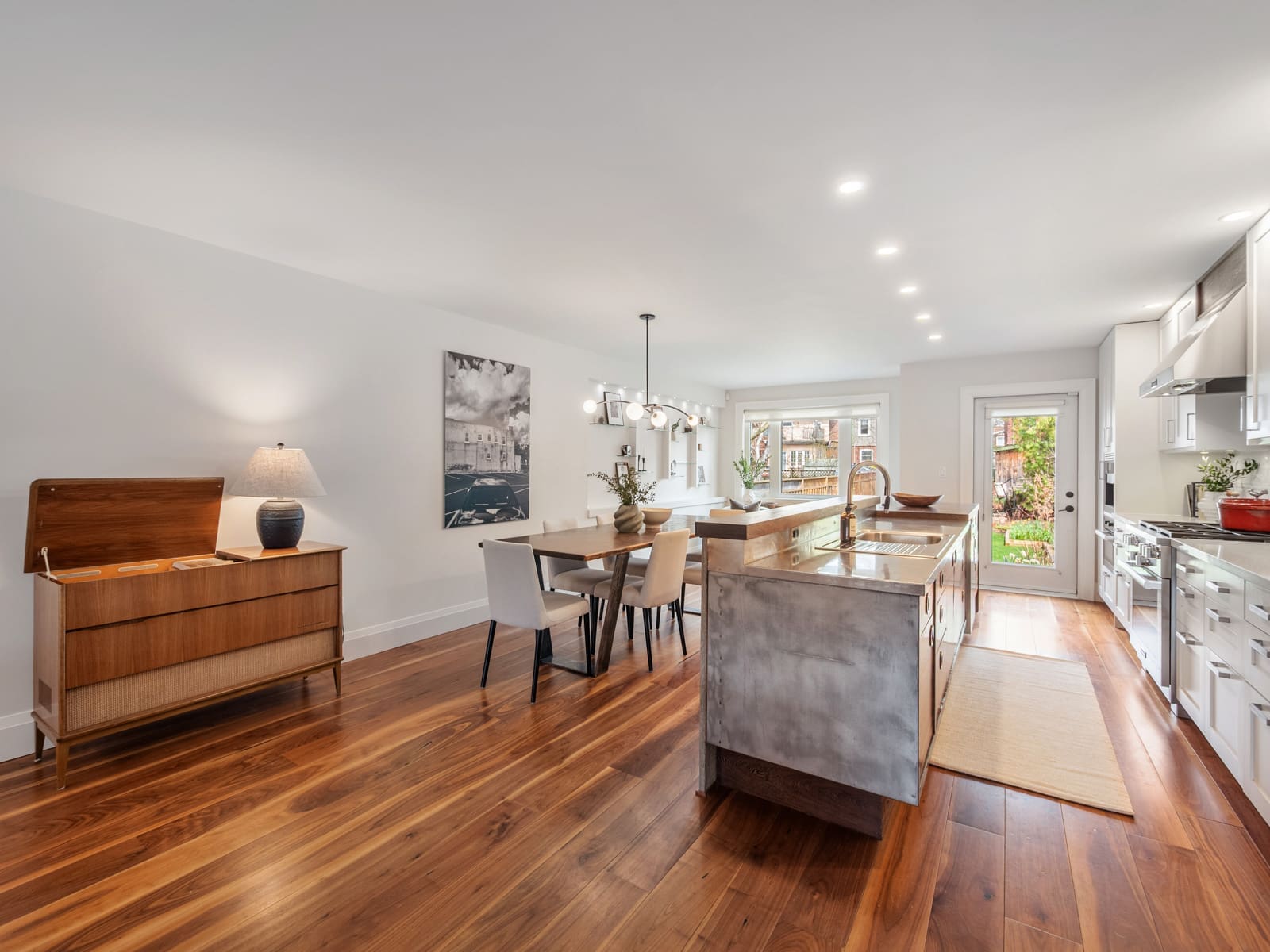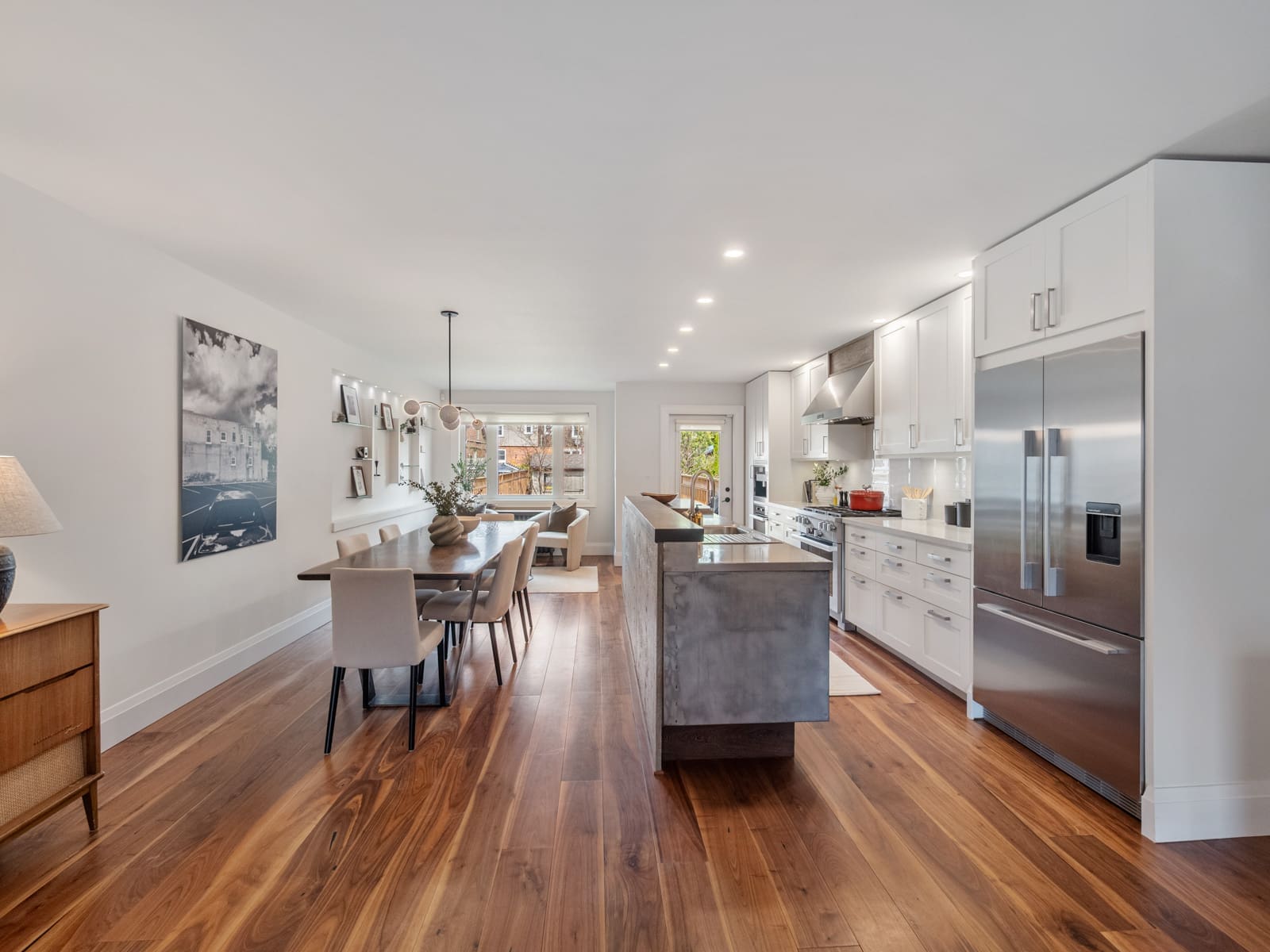 The main floor is both spacious and inviting, featuring rich hardwood floors, large picture windows that fill the space with natural light, and a layout designed for modern family living. At the heart of the home is a stunning kitchen with custom cabinetry, quartz countertops, high-end stainless-steel appliances, and a walk-out to the garden, ideal for both entertaining and everyday living.