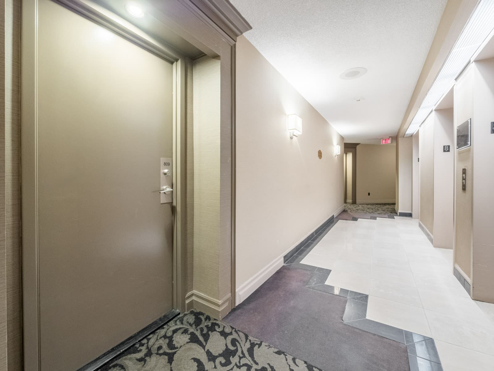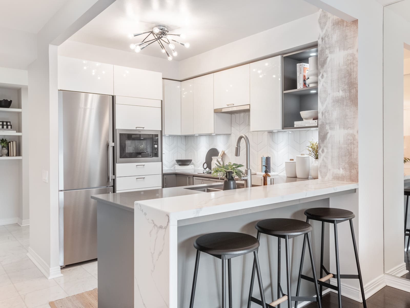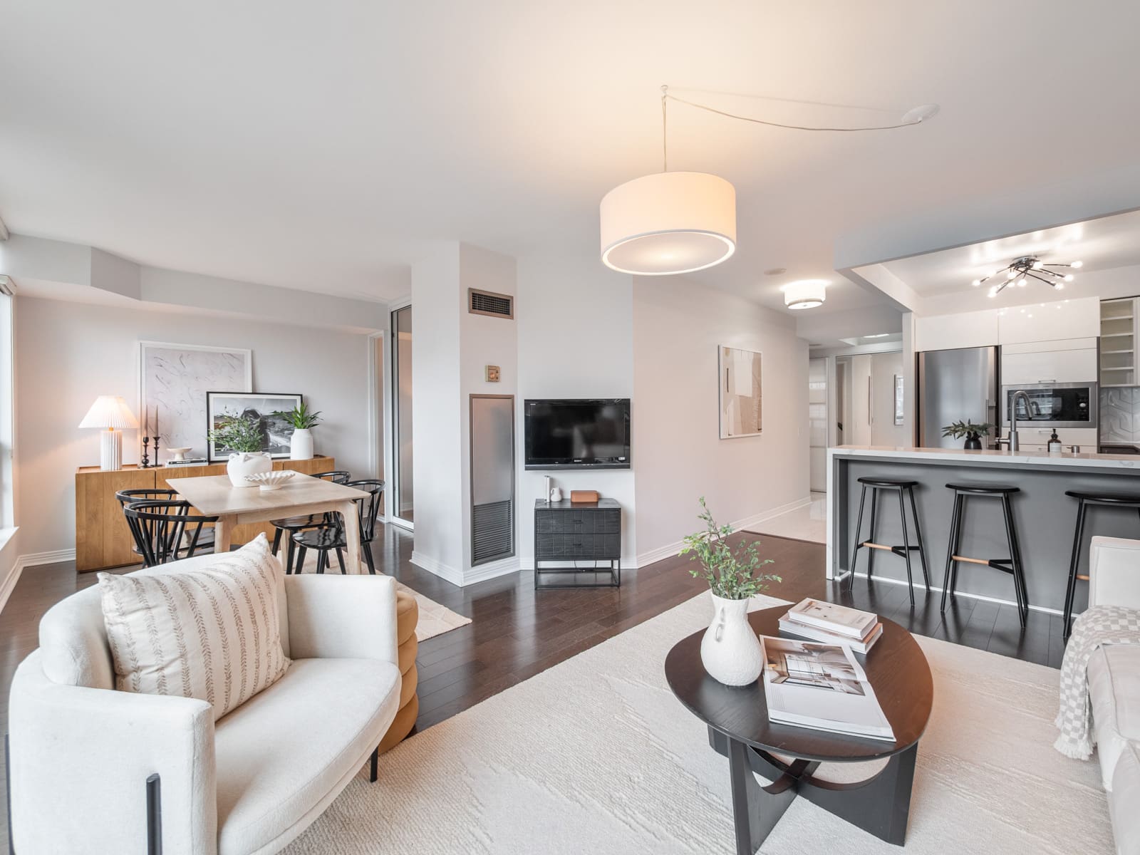 The suite has been meticulously upgraded throughout. The bespoke kitchen features custom cabinetry, quartz counters, a breakfast bar, and stainless-steel appliances — ideal for cooking, entertaining, or enjoying a quiet morning coffee. The renovated spa-inspired bathroom feels fresh and modern, while the engineered wood flooring and high baseboards add a crisp, elegant finish. The spacious primary bedroom easily accommodates a king-size bed, and the large den offers versatility as a dining room or dedicated home office.