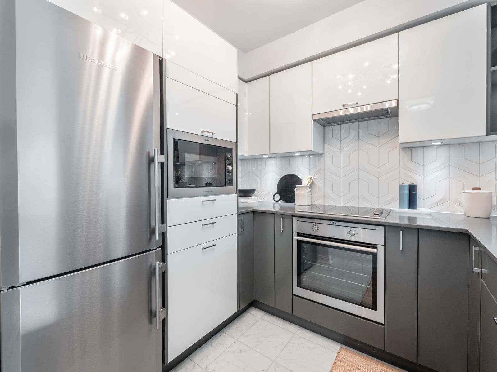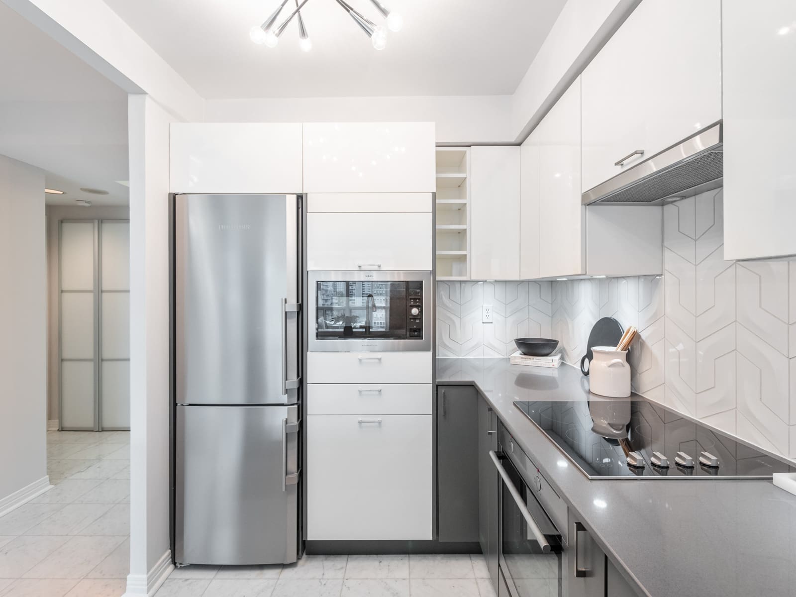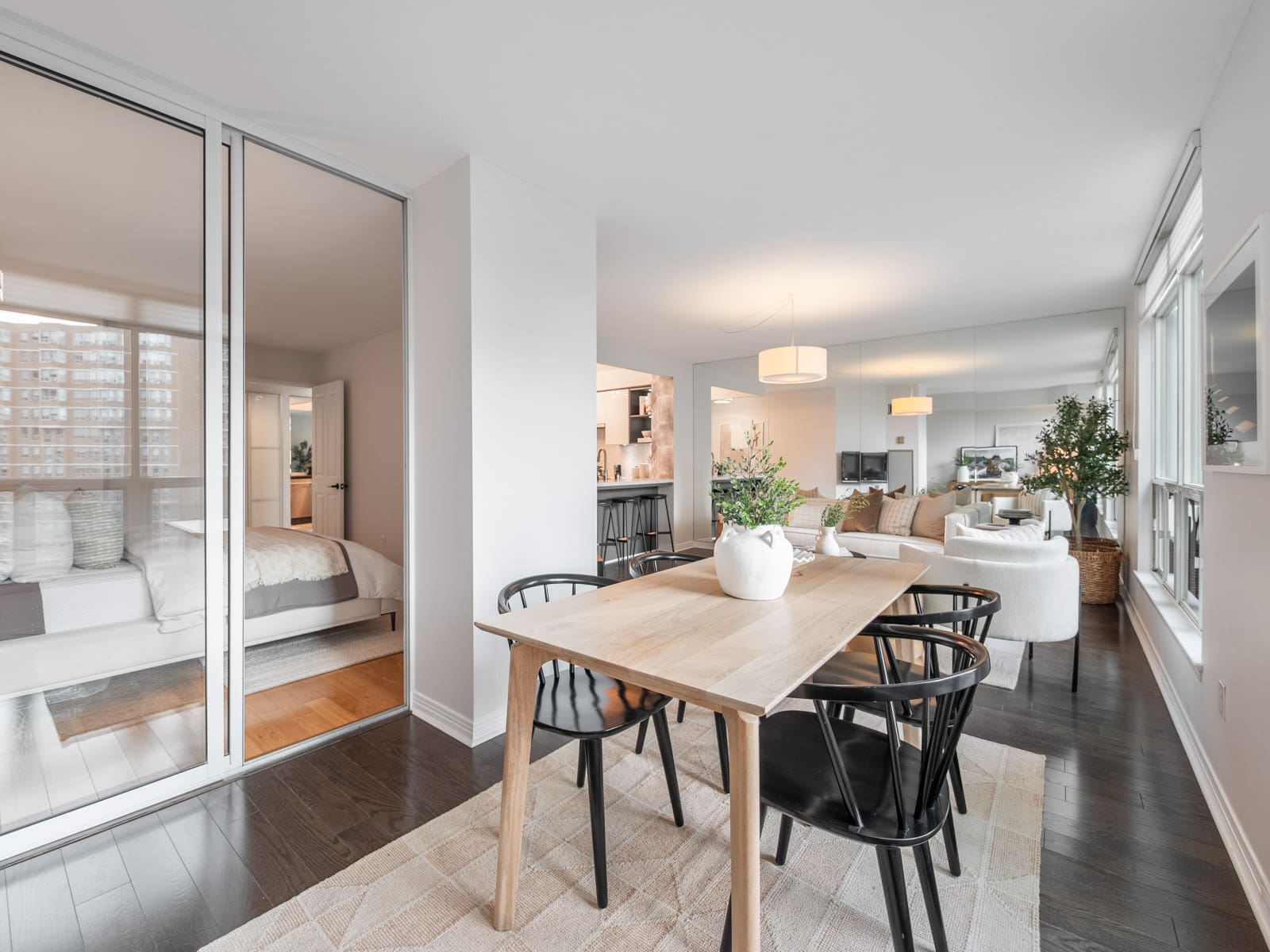 The suite has been meticulously upgraded throughout. The bespoke kitchen features custom cabinetry, quartz counters, a breakfast bar, and stainless-steel appliances — ideal for cooking, entertaining, or enjoying a quiet morning coffee. The renovated spa-inspired bathroom feels fresh and modern, while the engineered wood flooring and high baseboards add a crisp, elegant finish. The spacious primary bedroom easily accommodates a king-size bed, and the large den offers versatility as a dining room or dedicated home office.